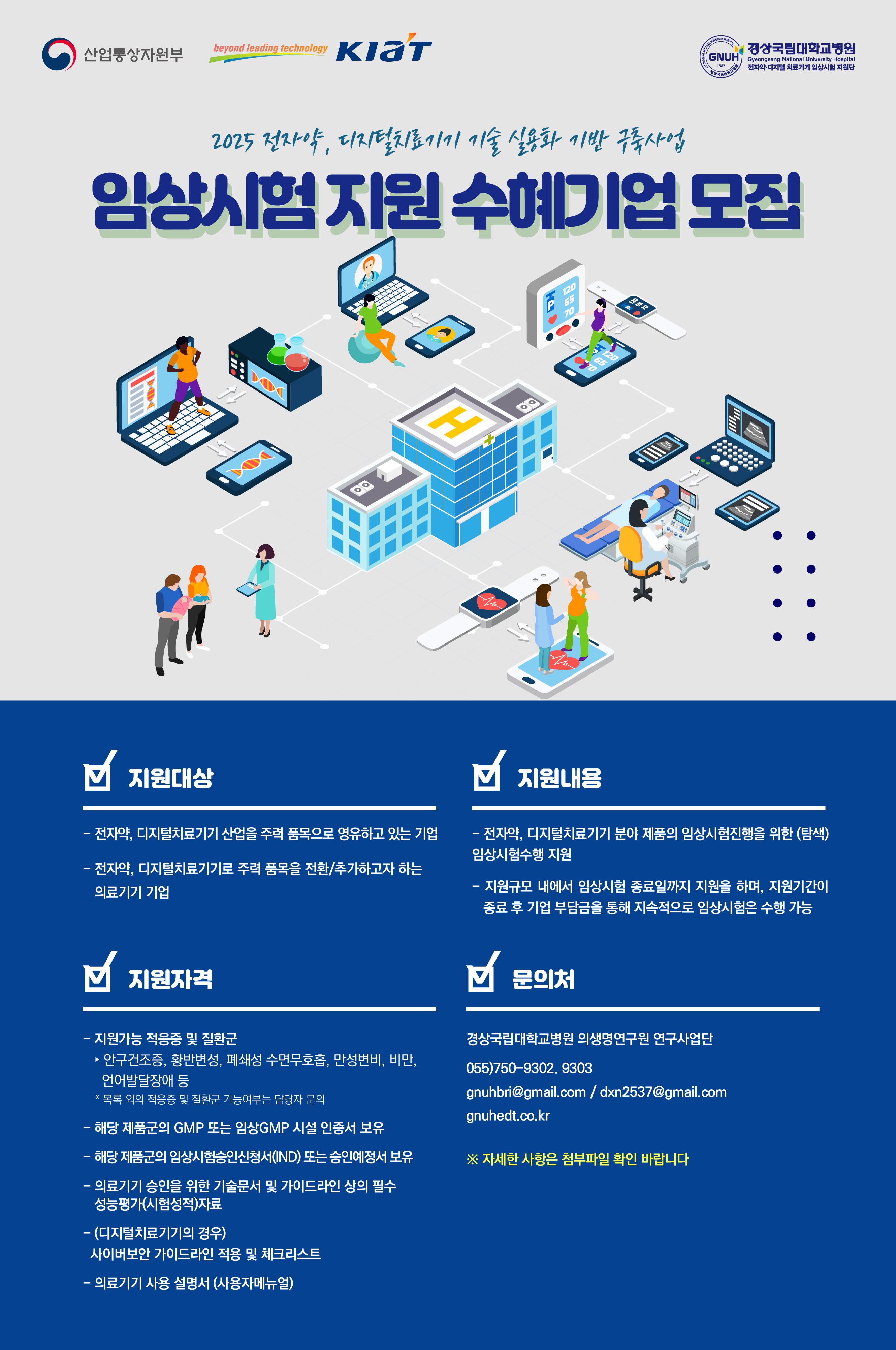 전자약, 디지털 치료기기 기반 구축을 통한 디지털바이오 전환 및 신성장동력 창출을 위하여 (재)경남테크노파크, 경상국립대학교병원이 연계하여 추진하는 「2025 전자약, 디지털 치료기기 기술 실용화 기반 구축사업」 임상시험 지원 수혜기업 4차 모집계획을 붙임과 같이 공고하오니 관련 기업에서는 많은 참여 바랍니다.